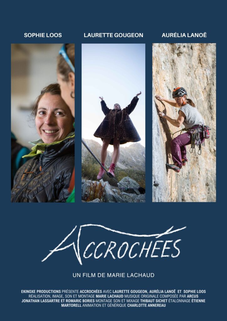 Synospis : Sophie est gardienne de refuge, Laurette est circassienne et metteuse en scène, Aurélia est guide de haute montagne. Ces trois femmes ont un point commun; Elles ont fait de la montagne leur métier, leur source de rêves et leur désir de partage. Accrochées est une ode à la femme en montagne. C’est le récit entremêlé de trois femmes le temps d’un été dans les Écrins. Trois femmes qui s’affirment, trois femmes qui inspirent.