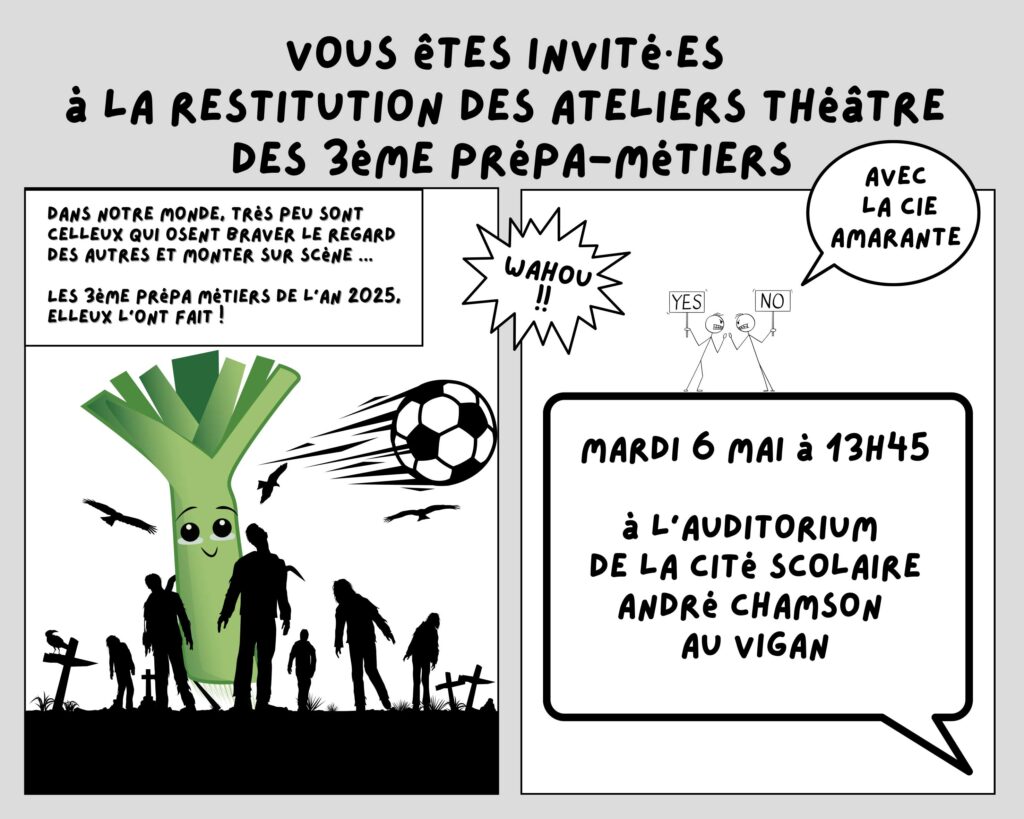 De février à mai 2025, au sein de la cité scolaire A.Chamson au Vigan, la classe de 3ème prépa métiers à participer à la création d’un spectacle inédit, fait de plusieurs scénettes mises en scène par Emilie Féret.